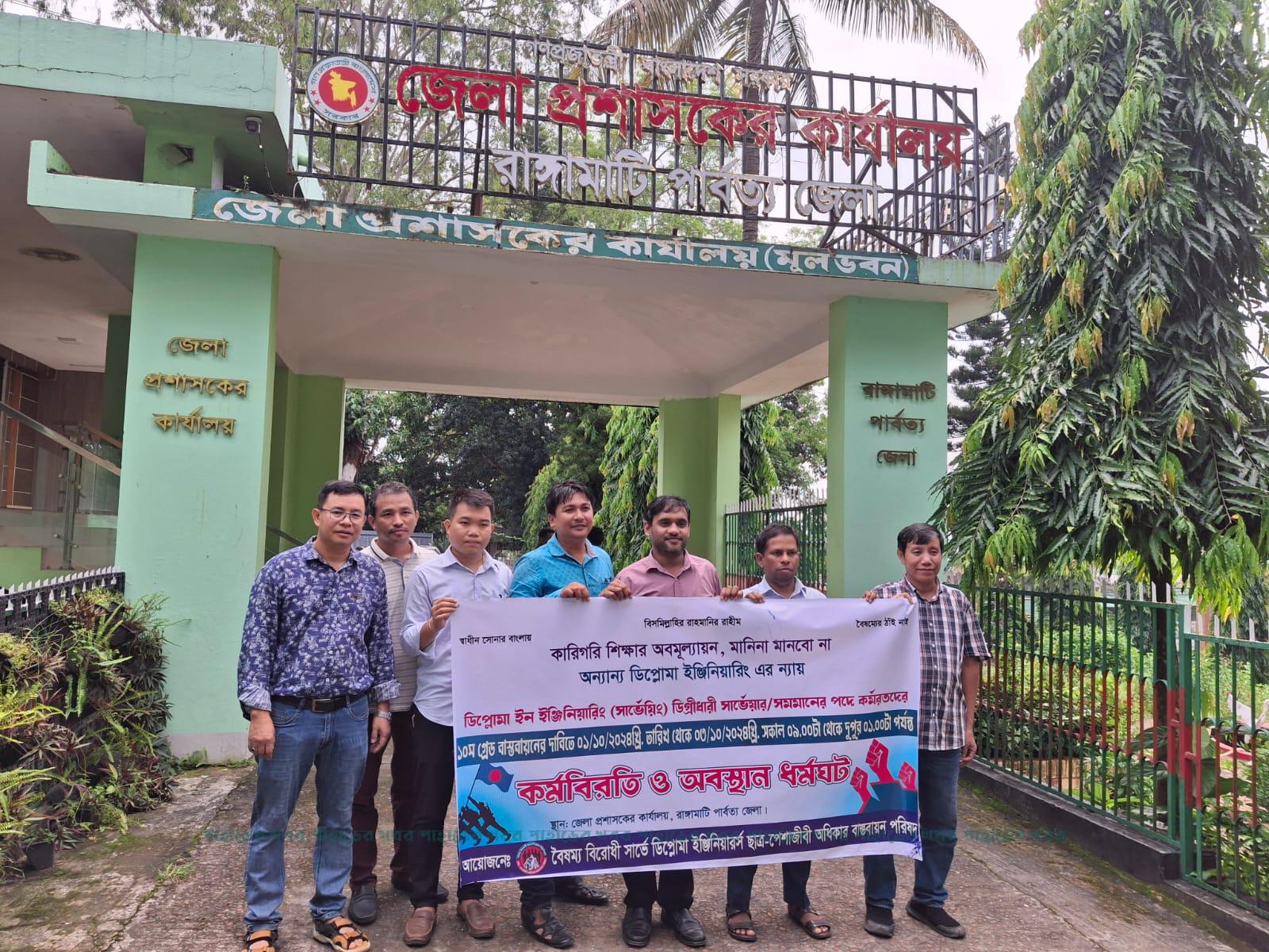 সার্ভেয়ারদের চাকরি ১০ম গ্রেডে উন্নীত করার দাবিতে রাঙামাটিতে কর্মবিরতি পালন করেছেন সার্ভেয়াররা। বাংলাদেশের অন্যান্য ডিপ্লোমা ডিগ্রীধারীদের ন্যায় ১০ম গ্রেড নিয়ে চাকরি করছে। ঠিক তাদের ন্যায় বাংলাদেশের সকল সার্ভে ডিপ্লোমা ও সমমানের সার্ভেয়ারদের ও ১০ম গ্রেড দিতে হবে এবং তা বাস্তবায়নের লক্ষে ন্যায্য দাবি করছি। দাবি আদায়ের জন্য বুধবার সকাল ৯টা হতে বেলা ১টা পর্যন্ত আমরা কর্ম-বিরতি পালন করছি। যদি আমাদের তাবি মানা না হয় তাহলে কেন্দ্রের সিদ্ধান্ত অনুযায়ী আমরা এখানেও কর্মসূচি দিতে বাধ্য হব বলেন কর্ম-বিরতির পালনকারী সার্ভেয়াররা। কর্ম-বিরতির বিষয়টি রাঙামাটি জেলা প্রশাসক মহোদয়কে অবগত করে একখানা স্বারকলিপি প্রদান করা হয়।