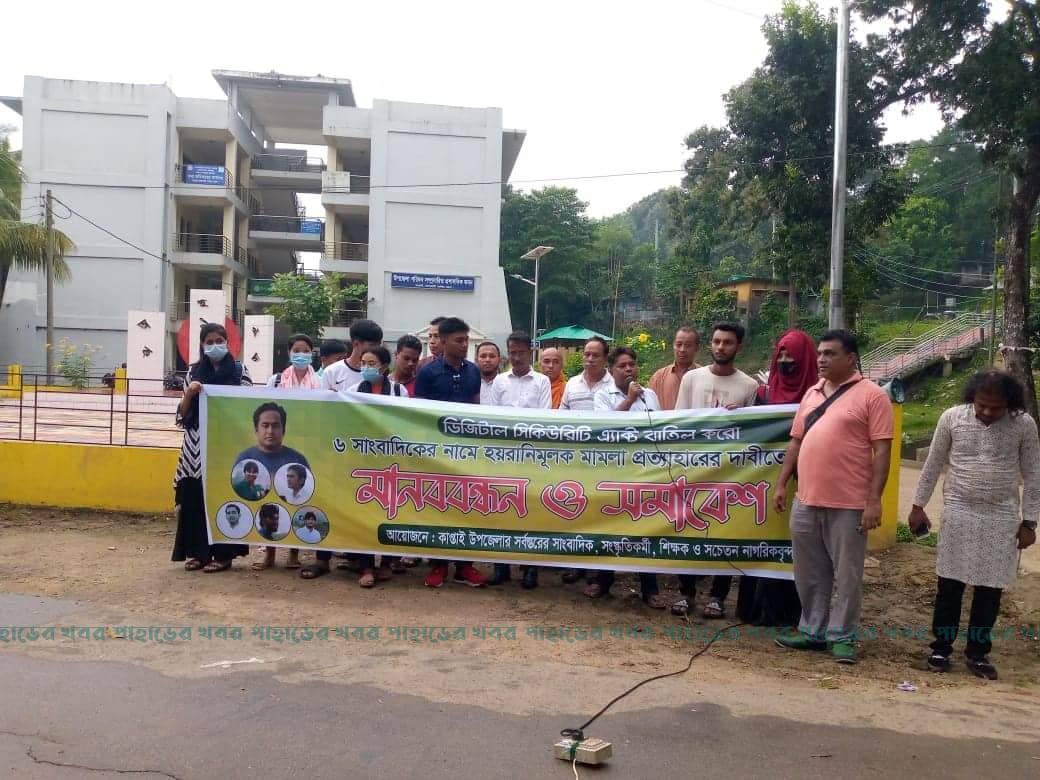 ডিজিটাল সিকিউরিটি এ্যাক্ট বাতিল, রাঙামাটির ৬ জন সাংবাদিকদের বিরুদ্ধে ডিজিটাল নিরাপত্তা আইনে মামলার প্রতিবাদে কাপ্তাইয়ে রবিবার (২২ অক্টোবর) সকাল ১১টায় এক মানববন্ধন কর্মসূচী অনুষ্ঠিত। কাপ্তাই সড়কের বড়ইছড়ি সদরে অনুষ্ঠিত এই মানববন্ধনে