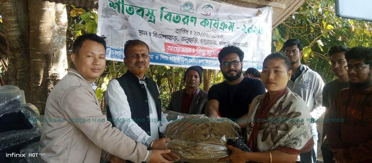 শুক্রবার (২০ জানুয়ারি) সকাল ১০ টায় ডলুছড়ি ঘাটে বিতরণ অনুষ্ঠানে ৩২২নং নারানগিরি মৌজার হেডম্যান উবাথোয়াই চৌধুরী, ১নং ওয়ার্ডের ইউপি সদস্য মোঃ সেলিম, সংগঠনের সদস্য মোঃ এনাম এবং সদস্যরা উপস্থিত থেকে শীতার্তদের মাঝে শীতবস্ত্র তুলে দেন।
