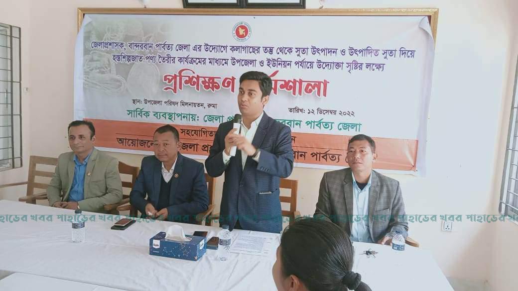 কলা গাছের তন্তু থেকে সুতা উৎপাদন ও উৎপাদিত সুতা দিয়ে হস্তশিল্প জাত পণ্য তৈরীর লক্ষ্যে রুমা উপজেলায় প্রথমবারের মতো কলা গাছের তন্তু হতে হস্তশিল্পের বিভিন্ন সৌখিন ব্যবহার্য জিনিসপত্র তৈরি হলেও এবারই প্রথম কাপড় তৈরীর উদ্যোগ নিয়ে প্রশিক্ষন কর্মশালা অনুষ্ঠিত হয়।