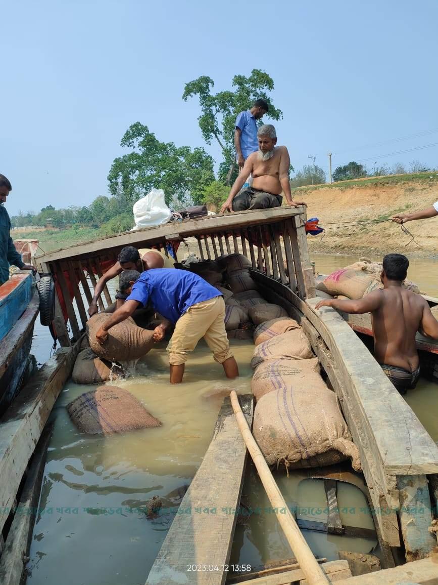 নৌকা ডুবে সব চাউল ভিজে নষ্ট হয়ে গেছে। স্থানীয়দের সহায়তায় চাল উদ্ধারের চেষ্টা চলছে।