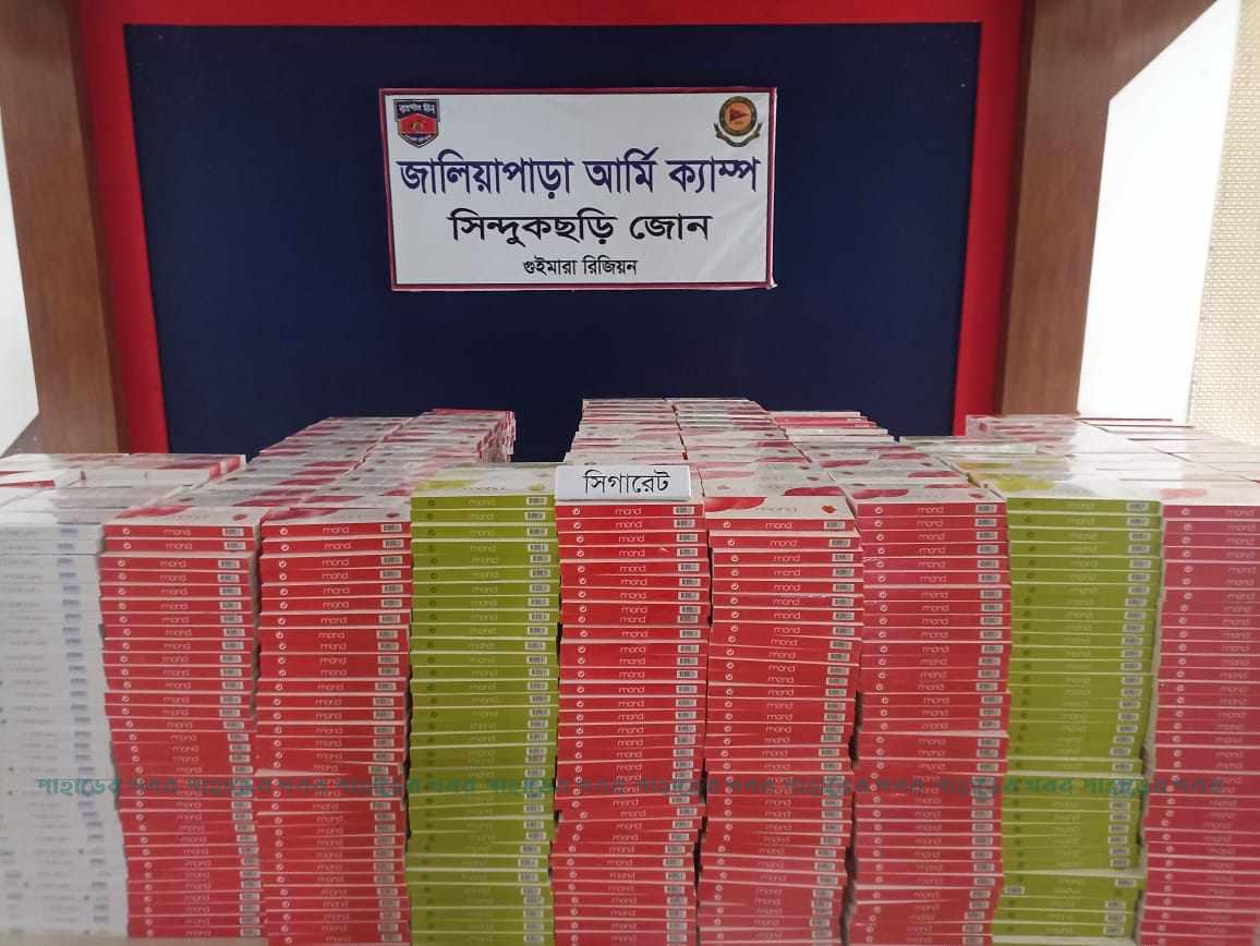 নিরাপত্তা বাহিনীর সূত্র যায়, গোপন সংবাদের ভিত্তিতে রোববার রাত ১ টায় জালিয়াপাড়া বাজারে একটি কাভার্ড ভ্যানে তল্লাশি চালিয়ে ২৯ কার্টুন সিগারেট, ২ কার্টুন ঔষধ ও ২ কার্টুন কাপড় জব্দ করা হয়। যার আনুমানিক বাজার মূল্য ৭৫ লাখ টাকা।