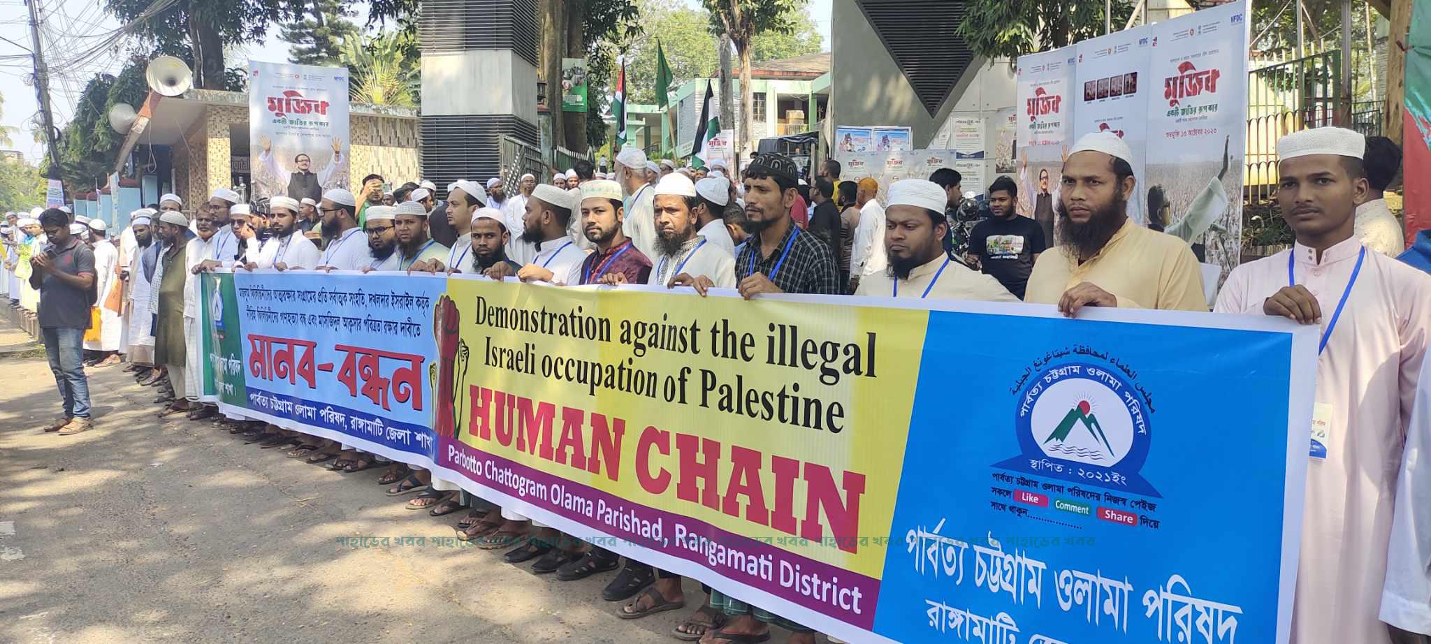 মজলুম ফিলিস্তিনীদের উপর গণহত্যা বন্ধ ও মাসজিদুল আক্বসার পবিত্রতা রক্ষার দাবীতে রাঙামাটিতে মানববন্ধন করেছে পার্বত্য চট্টগ্রাম ওলামা পরিষদ।