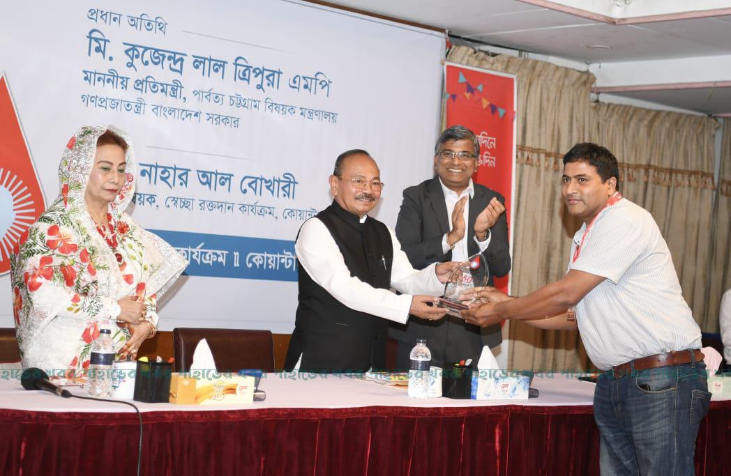 পার্বত্য চট্টগ্রাম বিষয়ক প্রতিমন্ত্রী কুজেন্দ্র লাল ত্রিপুরা এমপি বলেছেন, ‘রক্তদান মুমূর্ষুদের জীবন বাঁচাতে শ্রেষ্ঠ কাজ। একজন মানুষের মধ্যে মানবিক গুণ জাগ্রত হলেই রক্তদানের মতো এমন মহৎ কাজ করতে পারেন। আর রক্তদাতারা মানবিক গুণের অধিকারী।’