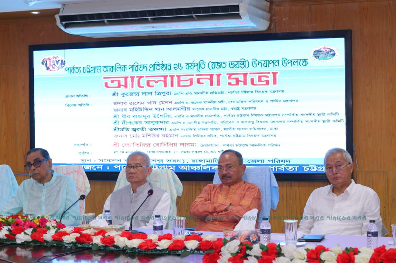 পার্বত্য চট্টগ্রাম আঞ্চলিক পরিষদের চেয়ারম্যান জ্যোতিরিন্দ্র বোধিপ্রিয় লারমার (সন্তু লারমা) সভাপতিত্বে অনুষ্ঠিত আলোচনা সভায় এসময় অন্যান্যের মধ্যে বেসামরিক বিমান পরিবহন ও পর্যটন বিষয়ক মন্ত্রণালয়ের সাবেক মন্ত্রী রাশেদ খান মেনন এমপি, পার্বত্য চট্টগ্রাম শরনার্থী বিষয়ক ট্রাস্কফোর্সের চেয়রাম্যান সুদত্ত চাকমা, পার্বত্য চট্টগ্রাম উন্নয়ন বোর্ড-এর চেয়ারম্যান সুপ্রদীপ চাকমা, সাবেক এমপি ঊষাতন তালুকদার, চাকমা সার্কেল চীফ ব্যরিস্টার রাজা দেবাশীষ রায়, খাগড়াছড়ি মং সার্কেল চীফ রাজা সাচিং প্রু চৌধুরী, মানবাধিকার কমিশনের সদস্য কংজরী চৌধুরী, রাঙ্গামাটি পার্বত্য জেলা পরিষদ চেয়ারম্যান অংসুই প্রু চৌধুরী, বান্দরবান জেলা পরিষদ চেয়ারম্যান ক্য শৈ হ্লা, অতিরিক্ত জেলা প্রশাসক(সার্বিক) মো: সাইফুল ইসলাম, অতিরিক্ত পুলিশ সুপার (সদর সার্কেল) মো. জাহিদুল ইসলাম,পার্বত্য চট্টগ্রাম আঞ্চলিক পরিষদ সদস্য ও পার্বত্য চট্টগ্রাম আঞ্চলিক পরিষদ প্রতিষ্ঠার ২৫ বর্ষপূর্তি উদযাপন কমিটির আহ্বায়ক গৌতম কুমার চাকমা, বিশিষ্ট শিক্ষাবিদ ও সমাজকর্মী শিশির চাকমা প্রমুখ উপস্থিত ছিলেন।