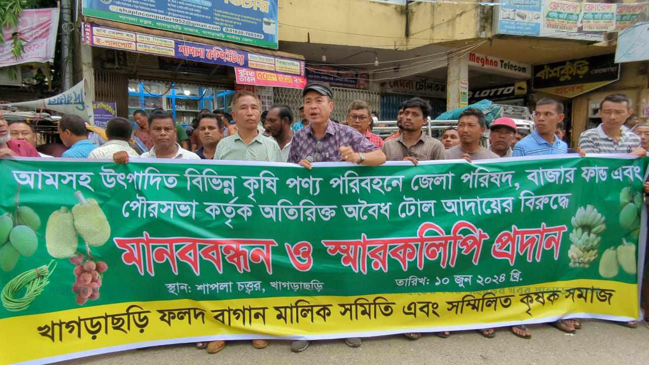 খাগড়াছড়ি পার্বত্য জেলায় প্রান্তিক চাষীদের উৎপাদিত ফসলে উপর তিনটি প্রতিষ্ঠানের অতিরিক্ত টোল আদায়ের প্রতিবাদের মানববন্ধন ও প্রতিবাদ সভা করেছে কৃষকদের আটটি কৃষক সংগঠন।