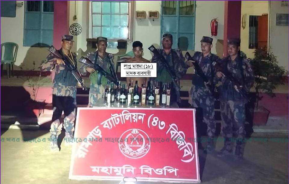 জানা গেছে, নিজস্ব গোয়েন্দা সংবাদের ভিত্তিতে গতকাল রাতে রামগড় ব্যাটালিয়ন (৪৩ বিজিবি) এর অধীনস্থ মহামুনি বিওপিতে কর্মরত সুবেঃ মোঃ জাহানুর ইসলাম এর নেতৃত্বে একটি টহল দল কর্তৃক রামগড় থানার অন্তর্গত মহামুনিপাড়া নামক স্থানে অভিযান পরিচালনা করে ১৬ বোতল ভারতীয় মদসহ হ্লাপ্রু মারমা নামের ওই মাদক ব্যবসায়ীকে আটক করতে সক্ষম হয়।