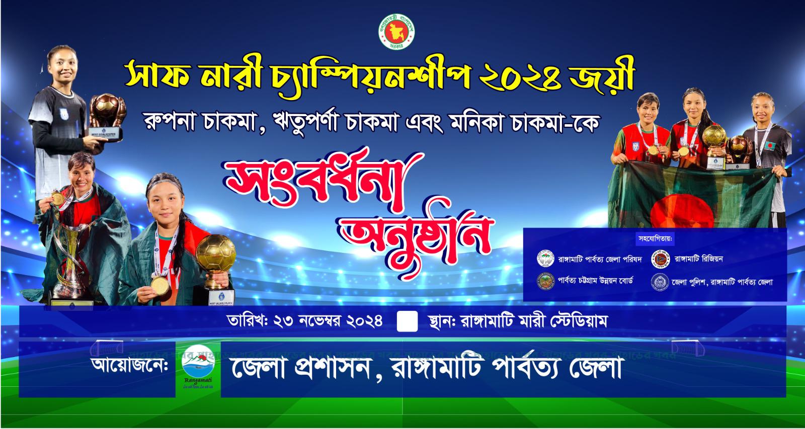সংবর্ধনা অনুষ্ঠানে সার্বিক সহযোগিতায় রয়েছেন পার্বত্য চট্টগ্রাম উন্নয়ন বোর্ড, রাঙামাটি পার্বত্য জেলা পরিষদ, রাঙামাটি রিজিয়ন, রাঙামাটি জেলা ক্রীড়া সংস্থা ও জেলা পুলিশ প্রশাসন। সাফ জয়ী নারীদের আগমনে রবরব সাজে সেজেছে মারী স্টেডিয়াম। নারী ফুটবলারদের আগমনে গোটা পথ ছেয়ে গেছে ফেস্টুন ব্যানারে। সাজানো হয়েছে বিশাল মঞ্চ ও আয়োজন করা হয়েছে সংস্কৃতির অনুষ্ঠানের আসর।