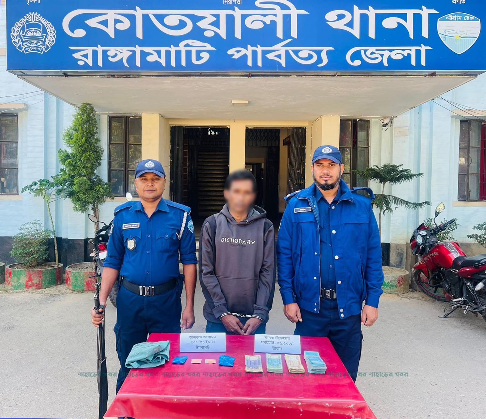 অভিযান পরিচালনাকালে কোতয়ালী থানাধীন ১ নং পৌর ওয়ার্ডস্থ মহসিন কলোনীর জৈনক চুন্নু মিয়ার দু-তলা বিশিষ্ট বাড়ির ছাদের উপর হইতে গ্রেফতারকৃত অভিযুক্ত মোঃ নাসির উদ্দিন প্রকাশ নাসির(৪০), পিতা-মৃত চুন্নু মিয়া, মাতা-লতিফুন নেসা, সাং-মহসীন কলোনী, ১নং ওয়ার্ড, রাঙামাটি পৌরসভা, থানা- কোতয়ালী, রাঙ্গামাটি পার্বত্য জেলা এর পরিহিত হুডির সামনের পকেটের ভিতর হতে ৫০০ (পাঁচশত) পিস ইয়াবা ট্যাবলেট (মাদকদ্রব্য) এবং মাদক উদ্ধার করা হয়। যার সর্বমোট বিক্রয়মূল্য ৫৬,৫০০ (ছাপান্ন হাজার পাঁচশত) টাকা।