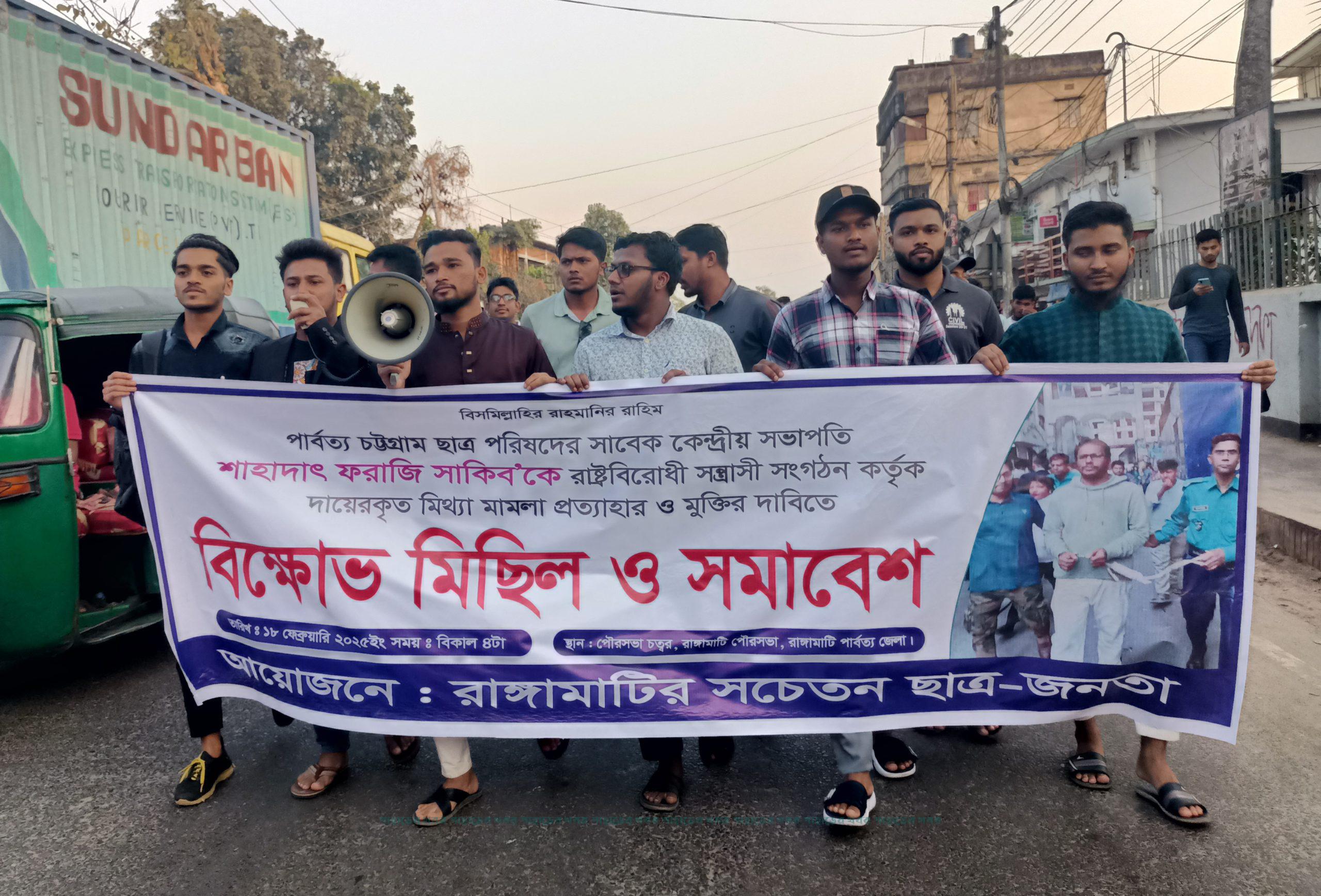 পার্বত্য চট্টগ্রাম ছাত্র পরিষদের সাবেক কেন্দ্রীয় সভাপতি শাহাদাৎ ফরাজি সাকিবের মুক্তির দাবিতে রাঙামাটি শহরে বিক্ষোভ মিছিল এবং সমাবেশ করেছে পার্বত্য চট্টগ্রামের সচেতন ছাত্র সমাজ। শাহাদাৎ ফরাজি সাকিব ষড়যন্ত্রের শিকার হয়েছেন বলে দাবি বিক্ষোভকারীদের।