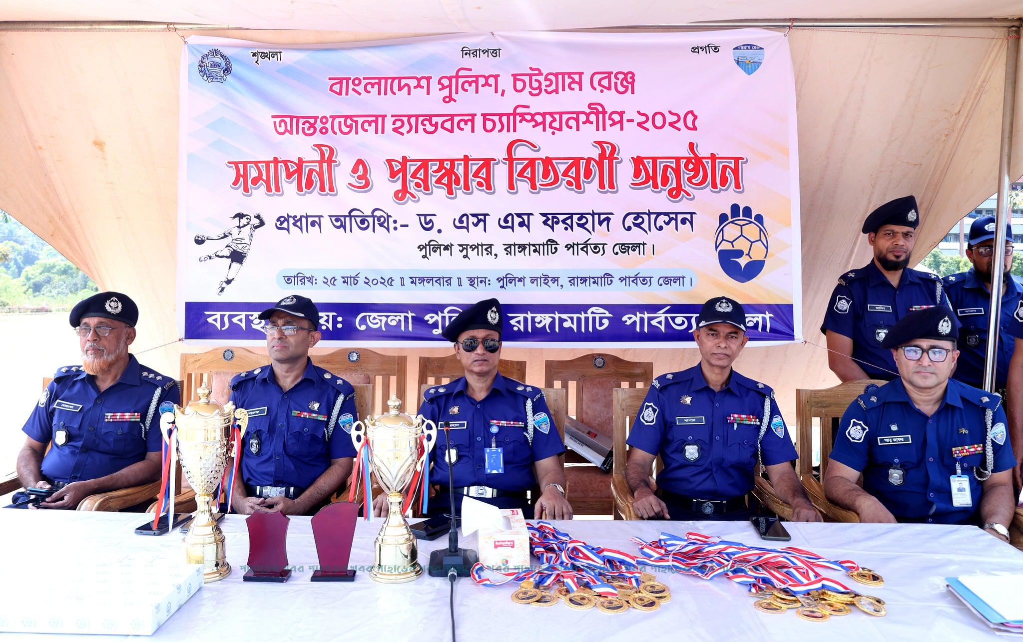 বাংলাদেশ পুলিশের চট্টগ্রাম রেঞ্জ আন্তঃজেলা হ্যান্ডবল চ্যাম্পিয়নশীপ-২০২৫ রাঙামাটি পার্বত্য জেলা পুলিশের ব্যবস্থাপনায় (মঙ্গলবার) রাঙামাটি পুলিশ লাইন্স মাঠে অনুষ্ঠিত হয়। হ্যান্ডবল চ্যাম্পিয়নশীপ-২০২৫ এর সমাপনী ও পুরস্কার বিতরণী অনুষ্ঠানে প্রধান অতিথি হিসেবে উপস্থিত ছিলেন, রাঙামাটি পার্বত্য জেলার পুলিশ সুপার ড.এস এম ফরহাদ হোসেন।