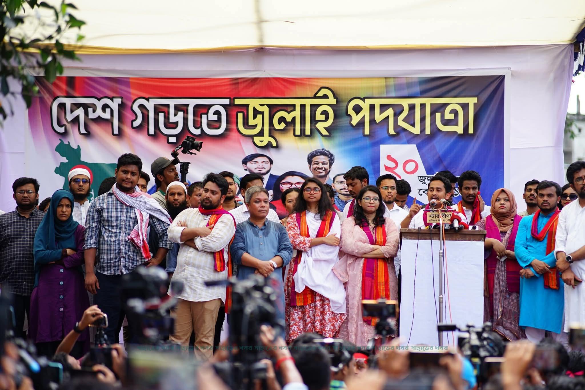 প্রধান অতিথির বক্তব্যে নাহিদ ইসলাম বলেন, আমরা পদযাত্রা নিয়ে প্রত্যেক সম্প্রদায়, জাতিগোষ্ঠীর নিকট প্রত্যেক জনপদে যাচ্ছি। পার্বত্য চট্টগ্রামে নানা বিভাজন, অশান্তি জিইয়ে রেখে কিছু গোষ্ঠী নিজেদের সুবিধা ও স্বার্থ হাসিল করে নিতে চাই। আমরা তাদের সেই সুযোগ দিতে চাই না। মুজিববাদী সংবিধানে এ দেশের সব জনগোষ্ঠীকে সম্পৃক্ত করা হয়নি। তাই সেই সংবিধানের প্রতিবাদ করেছিলেন পার্বত্য অঞ্চলের নেতা মানবেন্দ্র নারায়ণ লারমা। আমরা নতুন বাংলাদেশের নতুন সংবিধানে সব জনগোষ্ঠীর অন্তর্ভুক্তি চাই। এজন্য মুজিববাদী সংবিধান বাতিল করে সবার সংবিধান চাই। পার্বত্য চট্টগ্রামে যে বিভেদ, অশান্তি জিইয়ে রাখা হয়েছে তা দূর করতে হবে। তাই মুসলিম, হিন্দু, চাকমা, মারমা, ত্রিপুরাসহ সব জাতিগোষ্ঠীকে একত্রে ঐক্যবদ্ধ হয়ে লড়াই করতে হবে। আমরা সব জাতিগোষ্ঠীর সম্প্রীতি ও সৌহার্দ্যরে পার্বত্য চট্টগ্রাম গড়তে চাই। সৌহার্দ্যরে নতুন বাংলাদেশ গড়তে চাই। রাজনৈতিক দলগুলোর মধ্যেও এমন সৌহার্দ্য গড়ে তুলতে হবে।