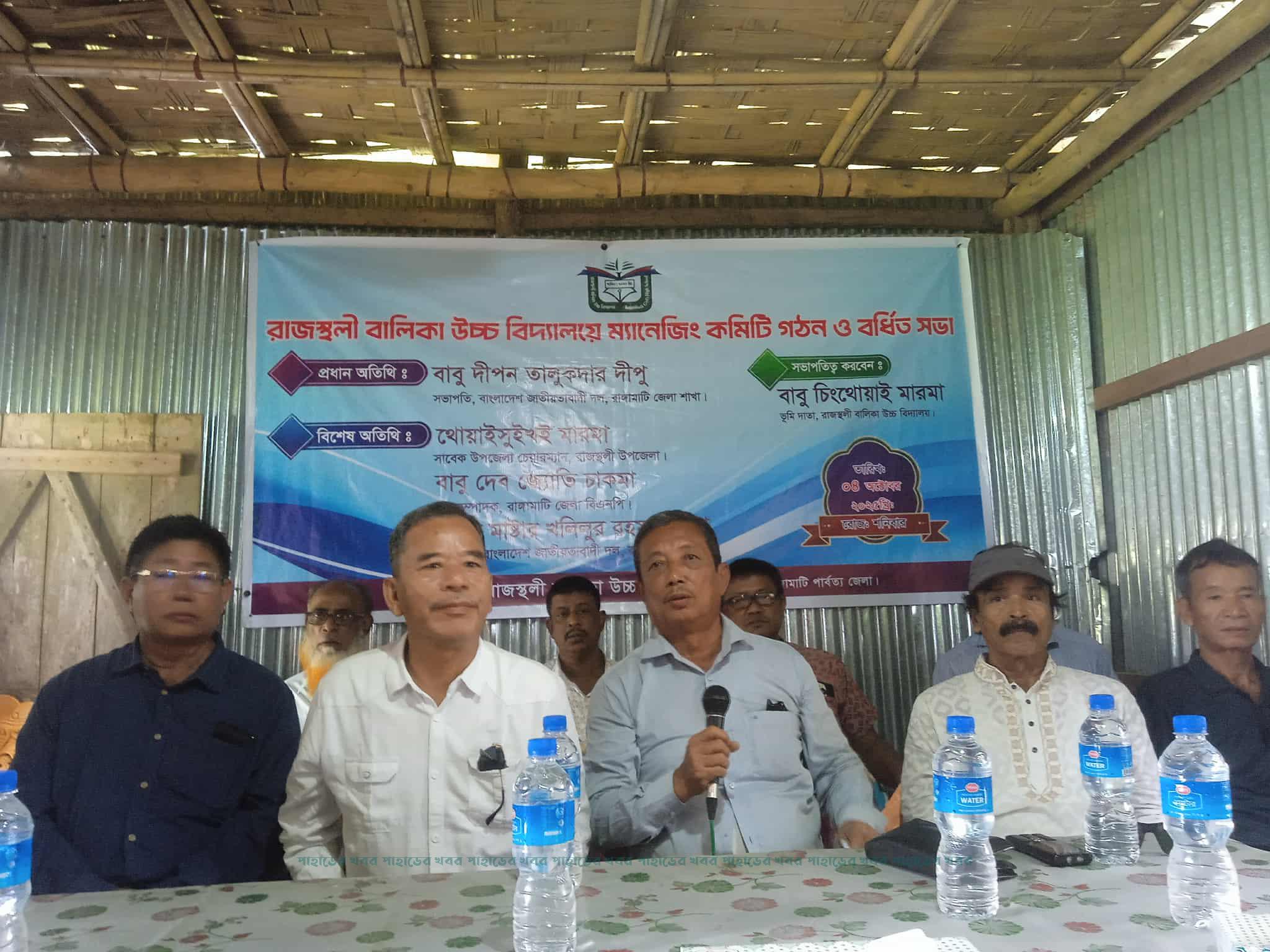 রাঙামাটি জেলার রাজস্থলী উপজেলায় রাজস্থলী বালিকা উচ্চ বিদ্যালয়ের ম্যানেজিং কমিটি গঠন ও বর্ধিত সভা অনুষ্ঠিত হয়েছে। বিদ্যালয়ের প্রধান শিক্ষকের ব্যবস্থাপনায় আয়োজিত এ সভায় সভাপতিত্ব করেন বিদ্যালয়ের ভূমিদাতা ও সাবেক সভাপতি চিংথোয়াই মারমা।