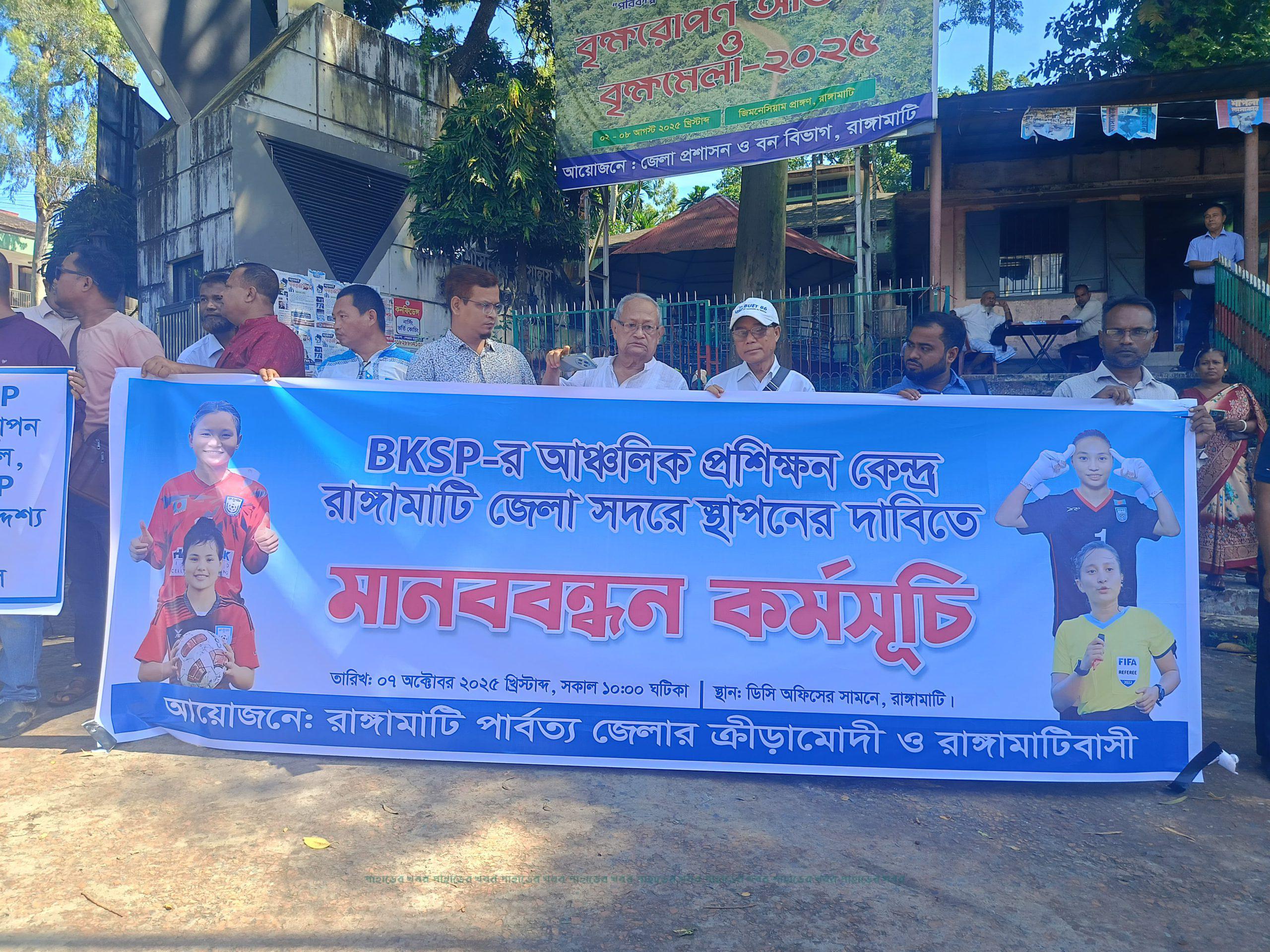 রাঙামাটি সদর উপজেলার ঝগড়া বিলেই বিকেএসপি আঞ্চলিক প্রশিক্ষণ স্থাপনের দাবিতে আজ মঙ্গলবার সকালে জেলা প্রশাসক কার্যালয়ের সামনে একটি মানববন্ধন অনুষ্ঠিত হয়। মানববন্ধনে জেলা বিএনপি’র সভাপতি, সহসভাপতি, জাতীয় দলের খেলোয়াড়, স্থানীয় ক্রীড়ামোদি সংগঠনের নেতৃবৃন্দ, বিভিন্ন ক্লাবের নেতৃবৃন্দ, সরকারি বেসরকারি চাকরিজীবি, সুশীল সমাজের নেতৃবৃন্দ, এনজিও নেতৃবৃন্দ ও স্থানীয় প্রিন্ট ও ইলেকট্টনিক্স মিডিয়ার সংবাদকর্মীগণ মানববন্ধনে অংশ গ্রহন করেন।