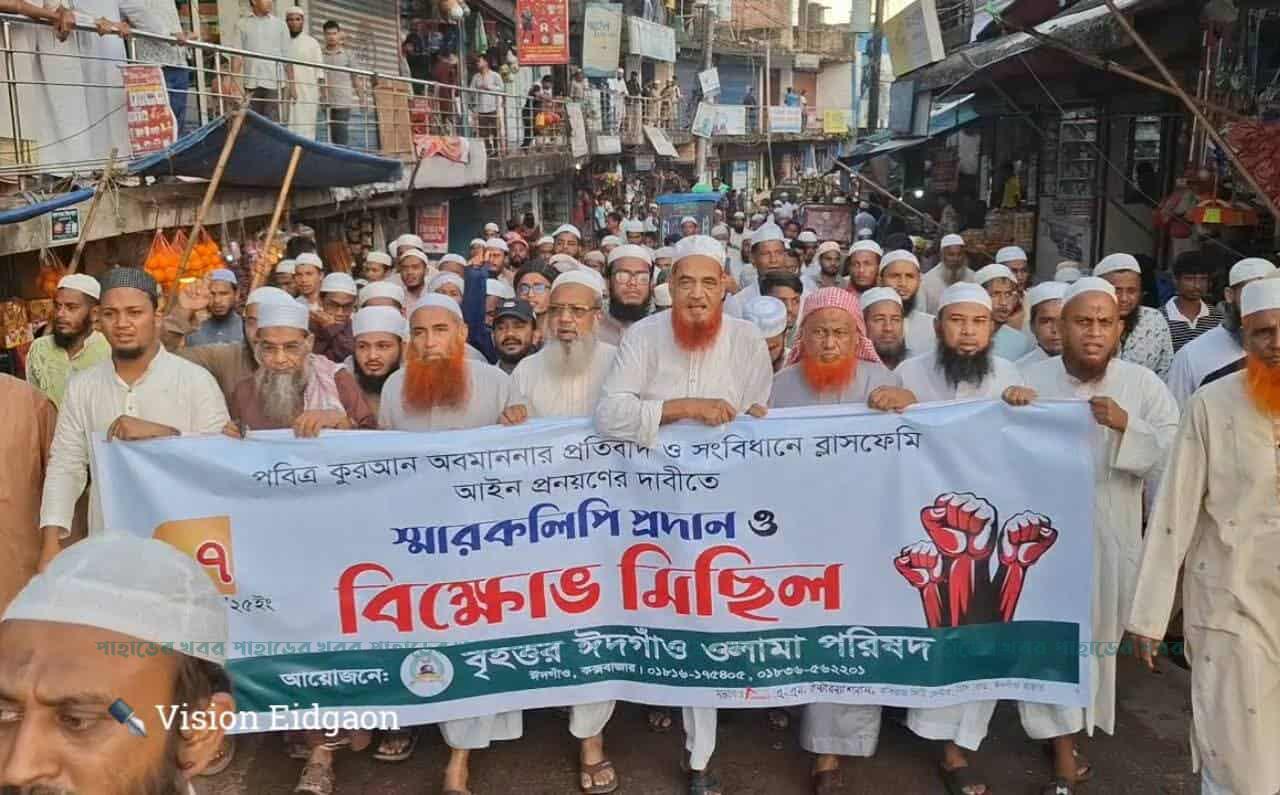 পবিত্র কোরআন অবমাননাকারী নর্থ সাউথ বিশ্ববিদ্যালয়ের সাবেক শিক্ষার্থী অপূর্ব পালের দৃষ্টান্তমূলক শাস্তির দাবিতে কক্সবাজারের ঈদগাঁও ওলামা পরিষদের উদ্যোগে বিক্ষোভ মিছিল ও সমাবেশ অনুষ্ঠিত হয়েছে।