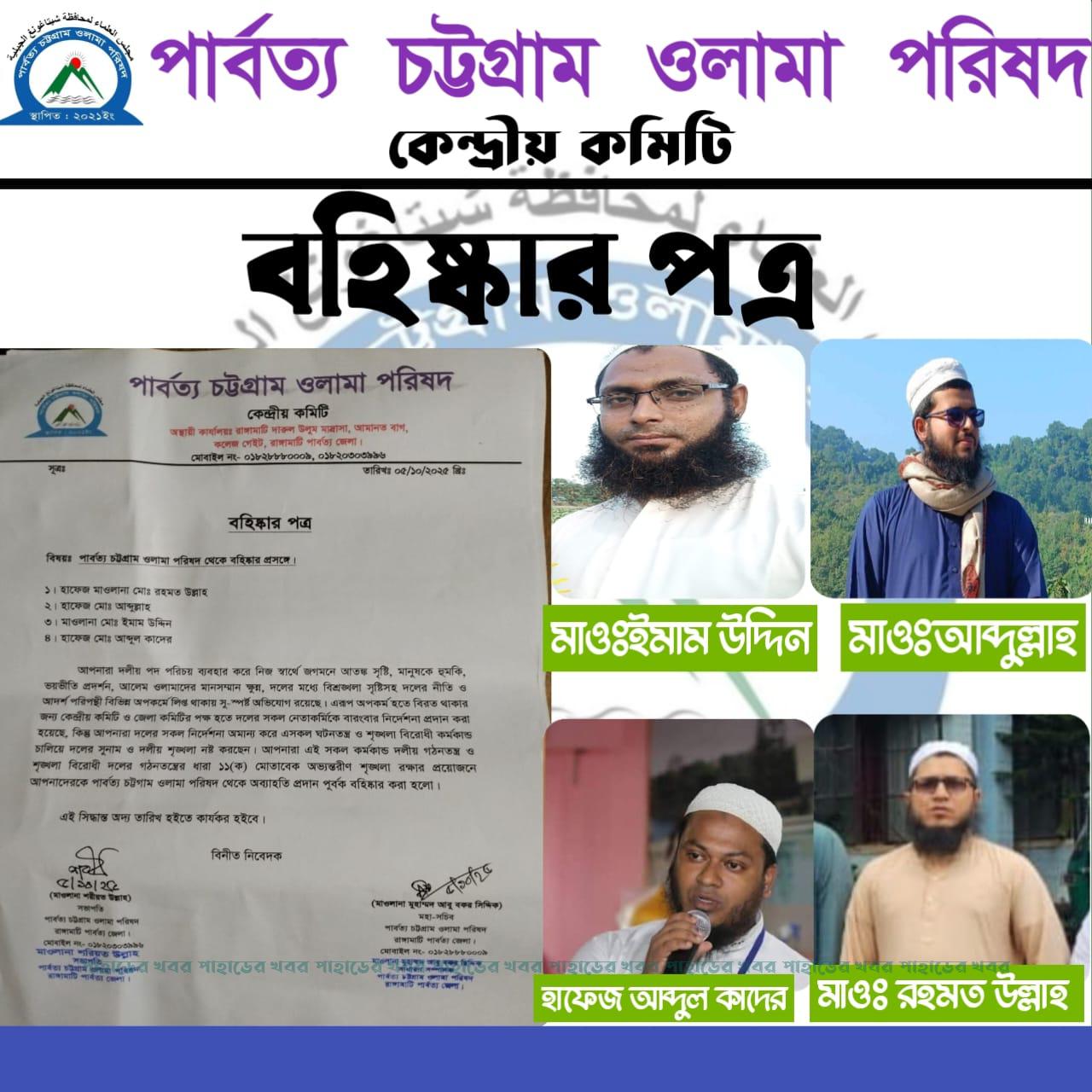 এতে বলা হয়, এই সকল কর্মকান্ডে দলীয় গঠনতন্ত্র ও শৃঙ্খলা বিরোধী দলের গঠনতন্ত্রের ধারা ১১(ক) মোতাবেক অভ্যন্তরীণ শৃঙ্খলা রক্ষার্থে পার্বত্য চট্টগাম ওলামা পরিষদ থেকে উপর উল্লেখিত ৪ নেতাকে গত (৫ অক্টোবর) অব্যাহতি প্রদান পূর্বক বহিষ্কারের সিদ্ধান্ত নেয়া হয়।