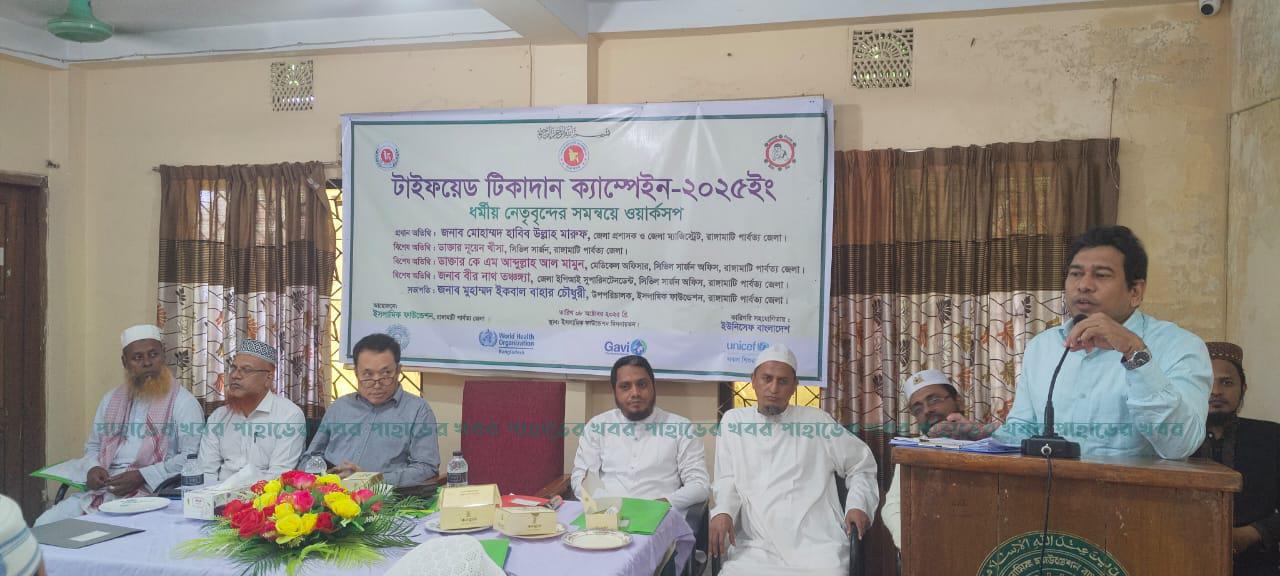 রাঙামাটি ইসলামিক ফাউন্ডেশনের আয়োজনে ধর্মীয় নেতৃবৃন্দের অংশগ্রহণে টাইফয়েড টিকাদান ক্যাম্পেইন-২০২৫ বিষয়ক দিনব্যাপী পরামর্শমূলক কর্মশালা অনুষ্ঠিত হয়েছে।বুধবার (৮ অক্টোবর) সকালে রাঙামাটি ইসলামিক ফাউন্ডেশন জেলা কার্যালয়ের মিলনায়তনে ইউনিসেফ বাংলাদেশের কারিগরি সহায়তায় এই ওয়ার্কসপ অনুষ্ঠিত হয়।