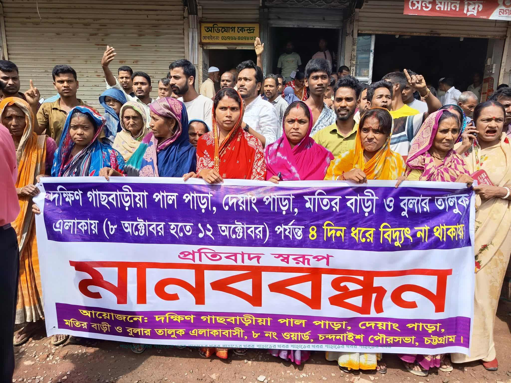 দক্ষিণ চট্টগ্রামের চন্দনাইশ পৌরসভার ৮ র্ন ওয়ার্ডস্থ দক্ষিণ গাছবাড়ীয়া পালপাড়া, দেয়াং পাড়া, মতির বাড়ি ও বুলার তালুক এলাকায় গত ৫ দিন যাবত বিদ্যুৎ না থাকায় প্রতিবাদ স্বরূপ পল্লী বিদ্যুৎ সমিতি চন্দনাইশের ডিজিএম মো. ফখরুদ্দিন এর পদত্যাগ চেয়ে মানববন্ধন করেছে স্থানীয় এলাকাবাসী। রোববার (১২ অক্টোবর) দুপুরে গাছবাড়ীয়া কলেজ গেইট এলাকায় পল্লী বিদ্যুৎ চন্দনাইশ জোনাল অফিসের সামনে এই মানববন্ধন অনুষ্ঠিত হয়।