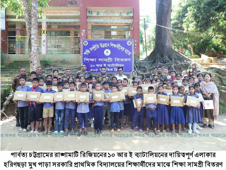 সোমবার(১৩ অক্টোবর ) জীবতলী আর্মি ক্যাম্পের আওতাধীন হরিনছড়া মুখ সরকারি প্রাথমিক বিদ্যালয়ের শিক্ষার্থীদের মধ্যে এই শিক্ষা উপকরণ বিতরণ করা হয়। মাননীয় সেনাবাহিনী প্রধানের দিক নির্দেশনায় ১০ আর ই ব্যাটালিয়ন অধিনায়ক লে: কর্নেল এ এস এম সাদিক শাহরিয়ার, পিএসসি তত্ত্বাবধানে এই শিক্ষা উপকরণ বিতরণ করা হয় । বিতরণ অনুষ্ঠানে ১১৯ নং ভাইয্যাতলী মৌজার হেডম্যান থোয়াই অং মারমা, স্কুলের প্রধান শিক্ষক ফেরদৌসী আক্তার উপস্থিত ছিলেন।