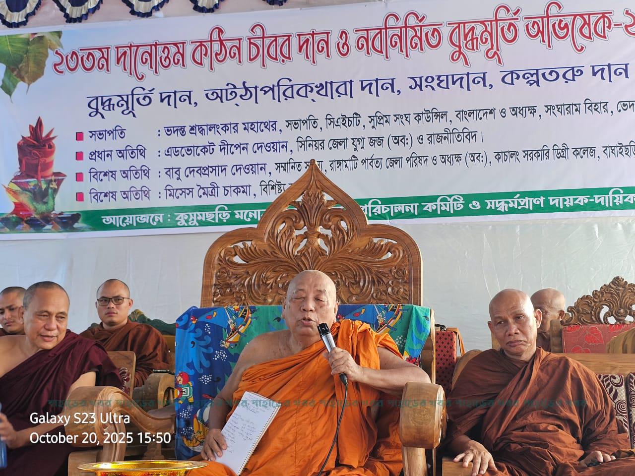 বরকল উপজেলার ২ নং বরকল ইউনিয়নের কুসুমপুর মনোরম বৌদ্ধ বিহার পরিচালনা কমিটি ও সদ্ধর্মপ্রাণ দায়ক-দায়িকাবৃন্দের আয়োজনে ২৩ তম শুভ দানোত্তম কঠিন চীবর দান ও নবনির্মিত বুদ্ধমূর্তি অভিষেক অনুষ্ঠান-২০২৫ আজ অনুষ্ঠিত হয়।
