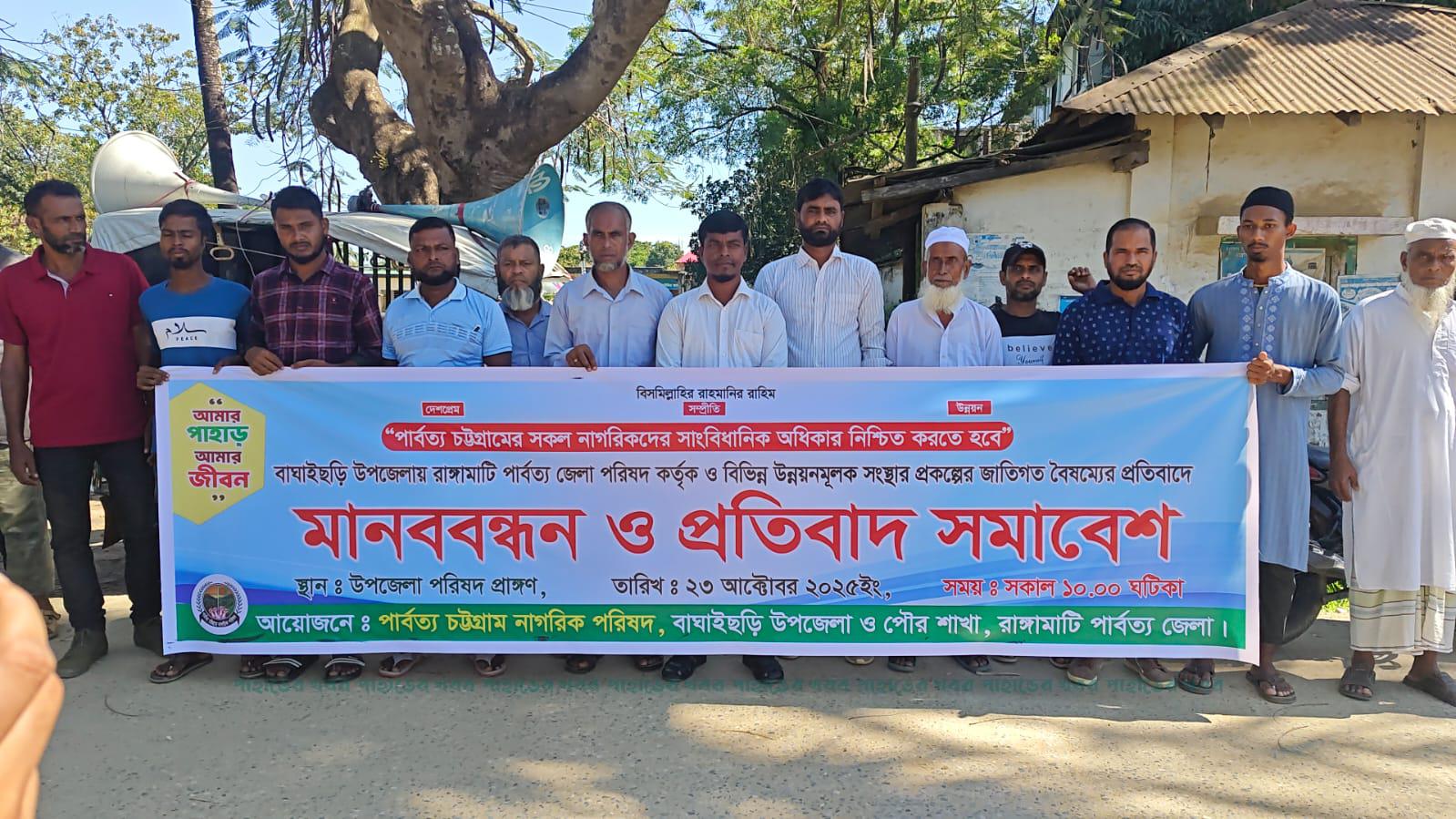 আজ বৃহস্পতিবার (২৩ অক্টোবর) সকাল ১০টায় পার্বত্য চট্টগ্রাম নাগরিক পরিষদের উদ্যোগে বাঘাইছড়ি উপজেলা পরিষদ প্রাঙ্গণে এ মানববন্ধন ও প্রতিবাদ সমাবেশ অনুষ্ঠিত হয়। এতে উপজেলার সর্বস্তরের সাধারণ মানুষ ও বিভিন্ন পেশার নাগরিকরা অংশগ্রহণ করেন।