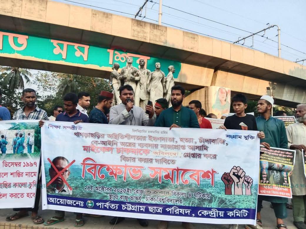 ঢাকা বিশ্ববিদ্যালয়ে ২৪ অক্টোবর ২০২৫ (শুক্রবার),বিকেল ৪টায় ঢাকা বিশ্ববিদ্যালয়ের টিএসসি রাজু চত্বরে অনুষ্ঠিত এই সমাবেশ থেকে মাইকেল চাকমাকে গ্রেফতার করে তার সাজা কার্যকর করা, ইউপিডিএফসহ পাহাড়ে সক্রিয় সকল সশস্ত্র সন্ত্রাসী গোষ্ঠীকে অবিলম্বে নিষিদ্ধ করে ও রাঙ্গামাটির কাপ্তাইয়ে প্রতিবন্ধি মারমা নারীকে মারমা যুবক কর্তৃক কয়েক মাস ধরে গণ ধর্ষনের ফলে অন্ত:সত্ত্বা করায় ধর্ষকদের বিচার নিশ্চিত করা,রাঙ্গামাটি জেলার বাঘাইছড়ি উপজেলার আমতলিতে গত সোমবার রাতে স্থানীয় সাধারণ বাঙালি পরিবারের ঘর ভাঙচুর ও কয়েক রাউন্ড গুলি নিক্ষেপ করে ভয় প্রদর্শন কারীদের দ্রুত গ্রেফতার করে বিচারের দাবি জানানো হয়।