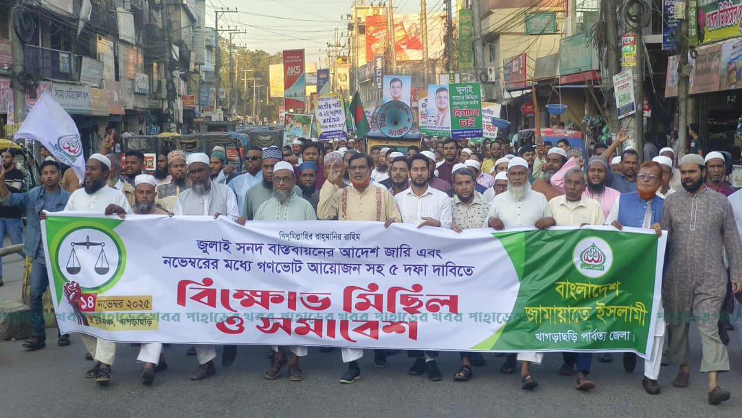 জুলাই সনদ বাস্তবায়নের আদেশ জারি এবং নভেম্বরের মধ্যে গণভোট আয়োজনসহ ৫ দফা দাবিতে বিক্ষোভ মিছিল ও সমাবেশ করেছে খাগড়াছড়ি জেলা বাংলাদেশ জামায়াতই সলামী।