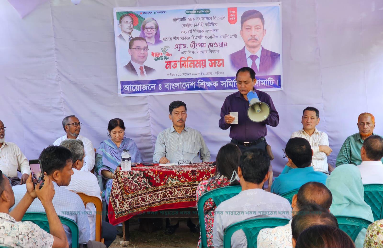 ২৯৯ নং রাঙামাটি সংসদীয় আসনে বিএনপি মনোনীত প্রার্থী রাঙামাটি জেলা বিএনপির সাবেক সফল সভাপতি, সাবেক সিঃযুগ্ম জেলা জজ ও বিএনপির জাতীয় নির্বাহী কমিটির সহ ধর্ম বিষয়ক সম্পাদক এডভোকেট দীপেন দেওয়ানের সাথে শিক্ষা সংস্কার বিষয়ক মত বিনিময় সভা অনুষ্ঠিত হয়েছে।