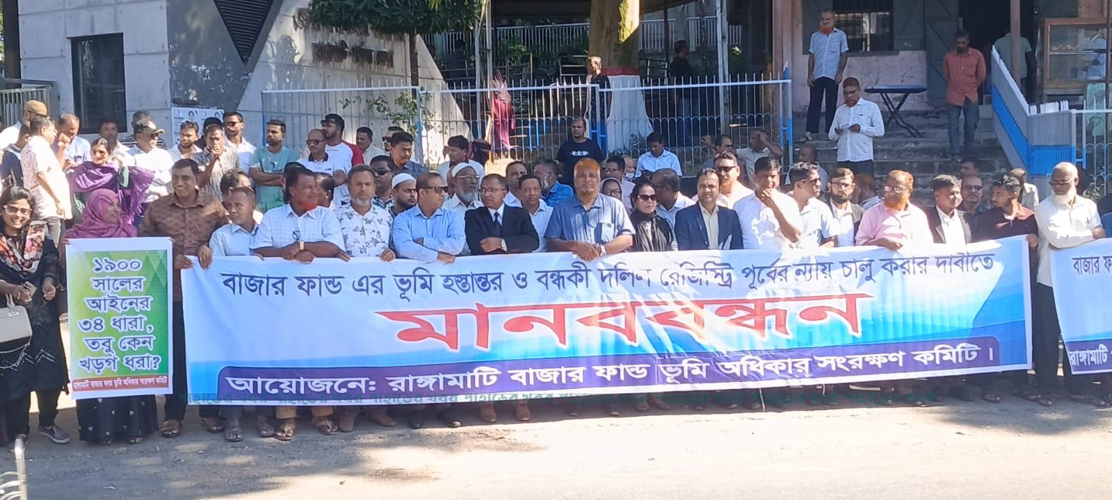 সভাপতিত্বে এই মানববন্ধন অনুষ্ঠিত হয়েছে। উক্ত মানববন্ধনে বাজার ফান্ডের আওতাধীন ব্যবসায়ি মহল ও সাধারণ মানুষ ব্যানার ও ফেস্টুন হাতে নিয়ে দলে দলে মানববন্ধনে অংশ গ্রহন করেন।ভূমি সংরক্ষণ আন্দোলন কমিটির আহবায়ক সাইফুল ইসলাম পনির বলেন, ২০১৯ সালে জেলা প্রশাসক মামুনুর রশিদ মামুনের আমলে ভূমি রেজিষ্ট্রেশন ও ভূমি বন্ধকী বন্ধ করে দেওয়া হয়। এই দাবি নিয়ে আমরা ভূমি মন্ত্রনালয়, পার্বত্য বিষয়ক মন্ত্রনালয়ের উপদেষ্টা, বিভাগীয় কমিশনার সহ সকলের দ্বারপ্রান্তে গিয়েছি। অদ্যবধি কেউ এই সমস্যার সমাধান করেনি। তাই বাধ্য হয়ে আমরা রাজপথে নেমেছি।