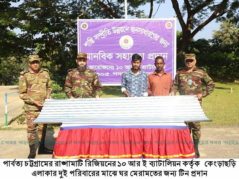 রবিবার (২৩ নভেম্বর) সম্মানিত সেনাবাহিনী প্রধানের দিক নির্দেশনায় এই ইউনিটের দায়িত্বপূর্ণ এলাকা কেংড়াছড়ি এলাকায় দুই  দরিদ্র মাঝে টিন তুলে দেন ১০ আর ই ব্যাটালিয়নের অধিনায়ক লেঃ কর্নেল এ এস এম সাদিক শাহরিয়ার, পিএসসি। এই সময় ব্যাটালিয়ন এর পদস্থ কর্মকর্তারা উপস্থিত ছিলেন। ১০ আর ই ব্যাটালিয়নের পক্ষ হতে ভবিষ্যতেও এ ধরনের কার্যক্রম শান্তি ও সম্প্রীতি উন্নয়নে অব্যাহত রাখার দৃঢ় প্রত্যয় ব্যক্ত করেন।