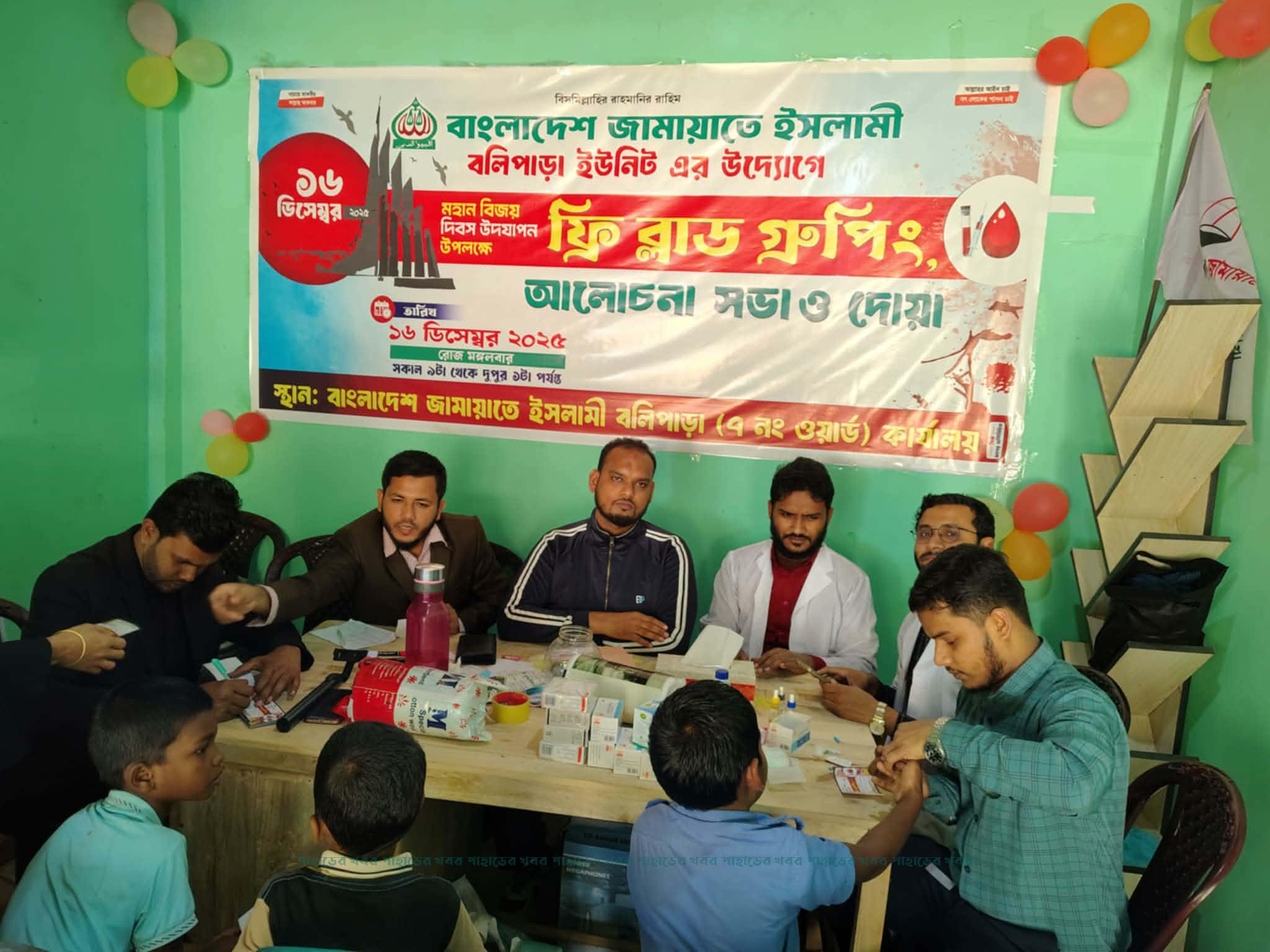বলিপাড়া ইউনিটের সভাপতি আবদুর রহমান এর সভাপতিত্বে অনুষ্ঠিত কর্মসূচিতে প্রধান অতিথি ছিলেন, সাবেক ছাত্র নেতা ও সমাজকর্মী আবদুল হক মানিক। সভায় বিশেষ অতিথি ছিলেন, উপজেলা শ্রমিক কল্যাণ সভাপতি আবদুল করিম, মেডিকেল টেকনলজিস্ট ইউনুস সিদ্দিকী ও মহরম হোসেন সহ প্রমুখ। এতে বিভিন্ন শিক্ষা প্রতিষ্ঠানের শিক্ষার্থীসহ নানা শ্রেণীপেশার মানুষ উপস্থিত হয়ে বিনামূল্যে রক্তের গ্রুপ পরীক্ষা করেন।