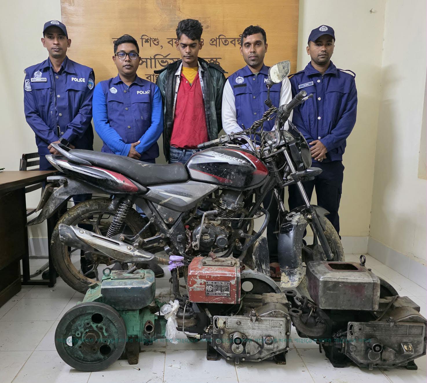 উদ্ধারকৃত মালামালের মধ্যে রয়েছে, একটি মটর সাইকেল যাহার রেজিঃ নং-চট্টঃ মেট্টোঃ-হ-১৭-৯৭২৯, মডেল-১১০ সিসি, চেচিস নং-MD2A15AYXJWG94856, ইঞ্চিন নং- JBYWJG52512 মোটর সাইকেল। তিনটি পুরাতন ইঞ্জিন,