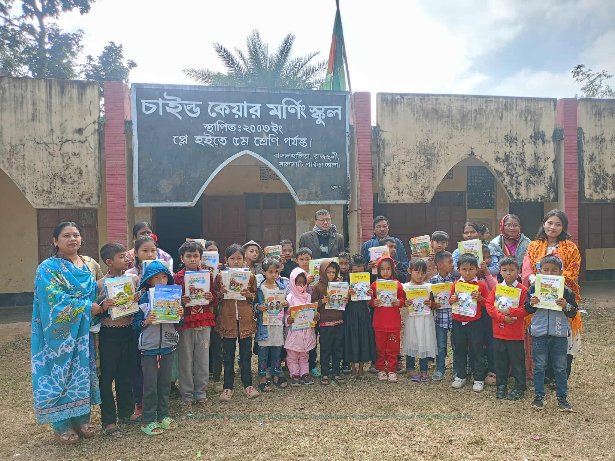 এরই ধারাবাহিকতায় রাজস্থলী উপজেলার ৩নং বাঙ্গালহালিয়া ইউনিয়নের বাঙ্গালহালিয়া আর্মি ক্যাম্প সংলগ্ন চাইল্ড কেয়ার মণিং স্কুলে আনুষ্ঠানিকভাবে নতুন বই বিতরণ কার্যক্রম শুরু করা হয়। স্কুলের প্রতিষ্ঠাতা পরিচালক সানুমং মারমা প্লে থেকে পঞ্চম শ্রেণি পর্যন্ত কোমলমতি শিক্ষার্থীদের হাতে নতুন বই তুলে দেন। নতুন বই হাতে পেয়ে শিক্ষার্থীরা আনন্দে মেতে ওঠে। বিনামূল্যে বই উপহার দেওয়ায় তারা করতালির মাধ্যমে স্কুলের শিক্ষক-শিক্ষিকা ও রাষ্ট্রপতির প্রতি কৃতজ্ঞতা প্রকাশ করে।
