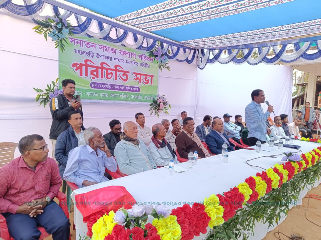 খাগড়াছড়ি পার্বত্য জেলার মহালছড়ি উপজেলায় সনাতন ধর্মাবলম্বীদের নবগঠিত সনাতন সমাজ কল্যাণ পরিষদ, মহালছড়ি উপজেলা কমিটির পরিচিতি সভা অনুষ্ঠিত হয়েছে।