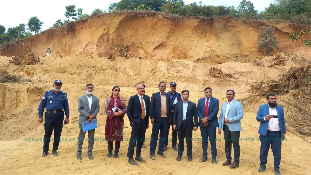 পাহাড় কেটে রামগড় স্থলবন্দরের জমি ভরাটের অভিযোগে তদন্ত টিমের পরিদর্শন ও নমূনা সংগ্রহ