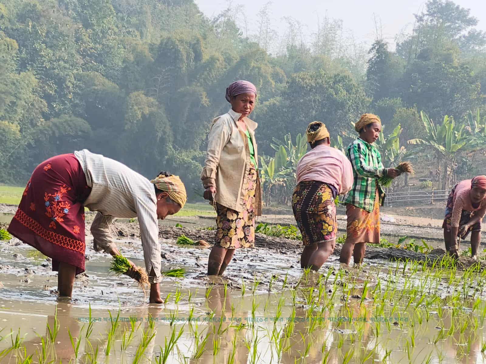 ছবিতে দেখা যায়, দলবদ্ধভাবে নারী কৃষকেরা ধানের চারা রোপণ করছেন। পাহাড়ি অঞ্চলের কৃষি সংস্কৃতিতে নারী-পুরুষ নির্বিশেষে সবাই মিলেই মাঠের কাজ করেন। এই সম্মিলিত অংশগ্রহণ শুধু কাজের গতি বাড়ায় না, বরং গ্রামীণ সমাজে পারস্পরিক সহযোগিতা, সহমর্মিতা ও সামাজিক বন্ধনকে আরও দৃঢ় করে।