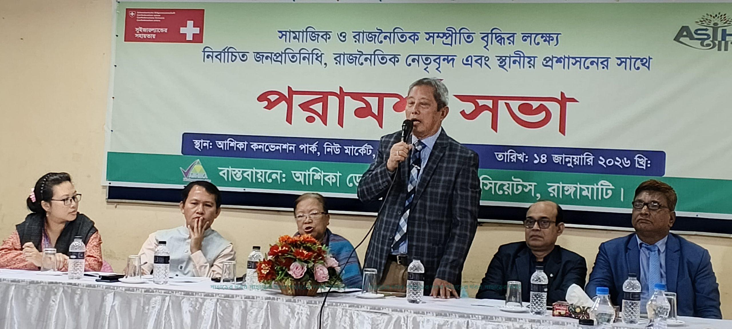 বুধবার সকালে শহরের আশিকা কনভেনশন হলে বেসরকারি উন্নয়ন সংস্থা আশিকা ডেভেলপমেন্ট অ্যাসোসিয়েটস পরিচালিত ‘আস্থা’ শীর্ষক প্রকল্প আয়োজিত পরামর্শ সভায় প্রধান অতিথি ছিলেন রাঙামাটি পার্বত্য জেলা পরিষদ চেয়ারম্যান কাজল তালুকদার। আস্থা প্রকল্পের সিভিক প্লাটফর্ম আহবায়ক শিক্ষাবিদ নিরুপা দেওয়ানের সভাপতিত্বে ও যুগ্ম আহবায়ক সুশীল প্রসাদ চাকমার পরিচালনায় অনুষ্ঠিত সভায় বিশেষ অতিথি ছিলেন আসন্ন ত্রয়োদশ জাতীয় নির্বাচনে ২৯৯-পার্বত্য রাঙামাটি আসনে জামায়াতে ইসলামীর সংসদ-সদস্য প্রার্থী অ্যাডভোকেট মোখতার আহম্মেদ, পার্বত্য চট্টগ্রাম আঞ্চলিক পরিষদের প্রতিনিধি চেয়ারম্যানের একান্ত সচিব উদ্ভাষণ চাকমা, যুব উন্নয়ন অধিদপ্তরের রাঙামাটির উপপরিচালক মো. শাহজাহান ও সমাজসেবা বিভাগের উপ-পরিচালক মো. ওমর ফারুক প্রমুখ।