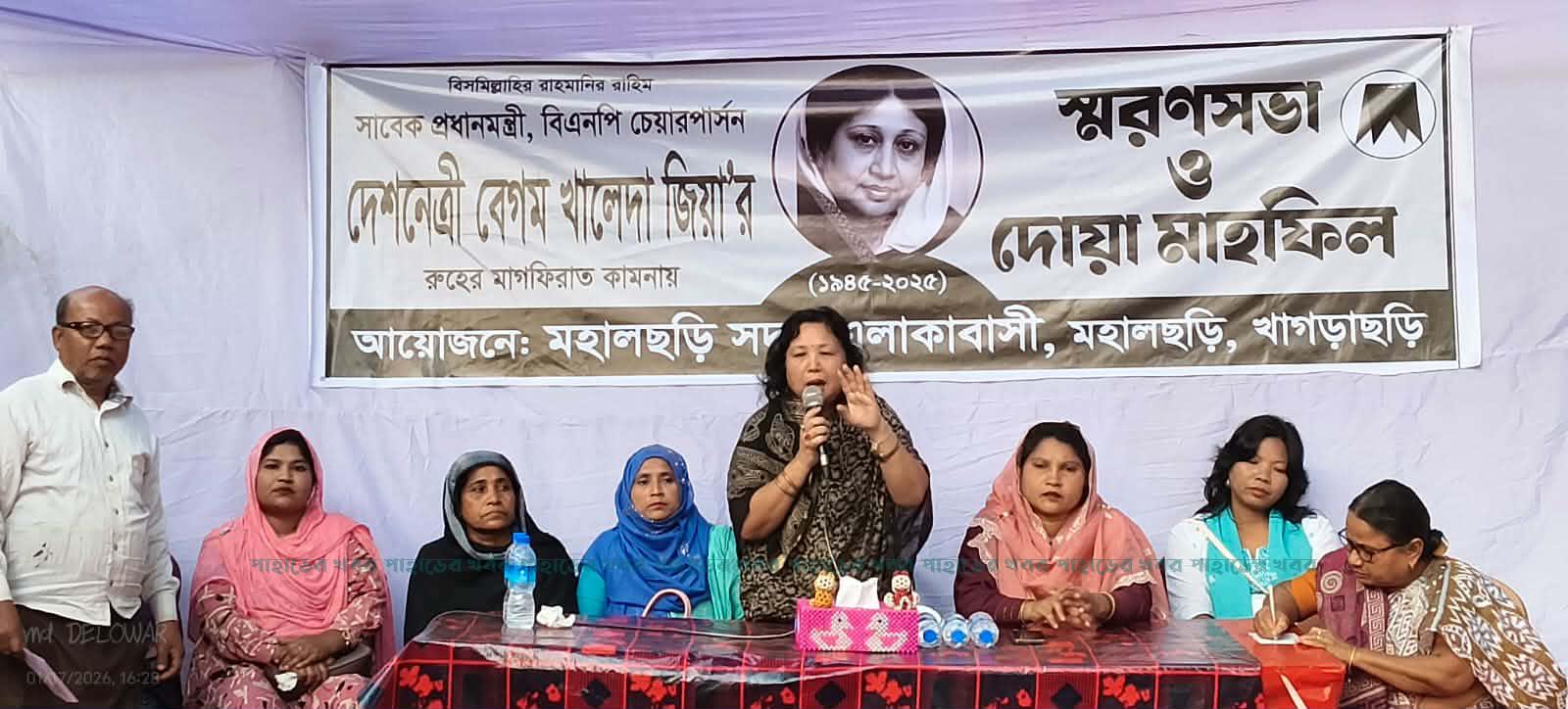 খাগড়াছড়ির পার্বত্য জেলার মহালছড়িতে সাবেক প্রধানমন্ত্রী ও বিএনপি চেয়ারপার্সন দেশনেত্রী বেগম খালেদা জিয়ার রুহের মাগফিরাত কামনায় স্মরণসভা ও দোয়া মাহফিল অনুষ্ঠিত হয়েছে।