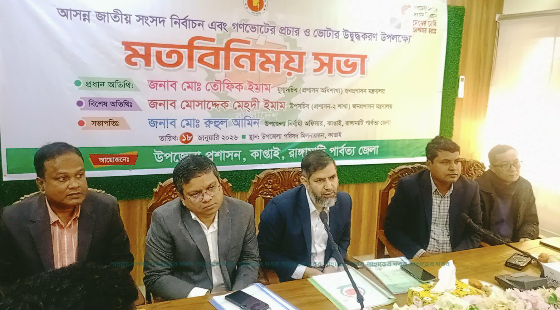 ত্রয়োদশ জাতীয় সংসদ নির্বাচন ও গণভোট-২০২৬ এর ভোটারদের ভোটদানে উদ্বুদ্ধকরণের লক্ষ্যে রাঙামাটির কাপ্তাইয়ে অংশীজনদের নিয়ে মতবিনিময় সভা অনুষ্ঠিত হয়েছে।