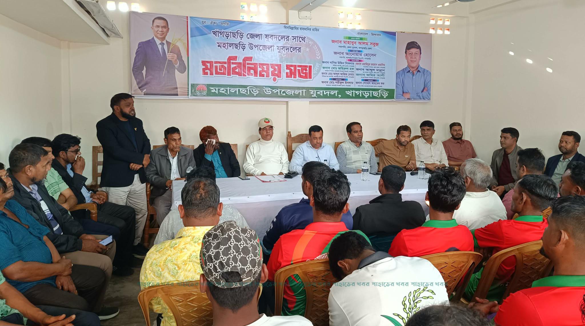 খাগড়াছড়ি জেলা যুবদলের সাথে মহালছড়ি উপজেলা যুবদলের উদ্যোগে মতবিনিময় সভা অনুষ্ঠিত হয়েছে। সোমবার (১৯ জানুয়ারী) বিকাল ৩:০০ ঘটিকায় উপজেলা বিএনপির দলীয় কার্যারয়ে এ সভা অনুষ্ঠিত হয়।