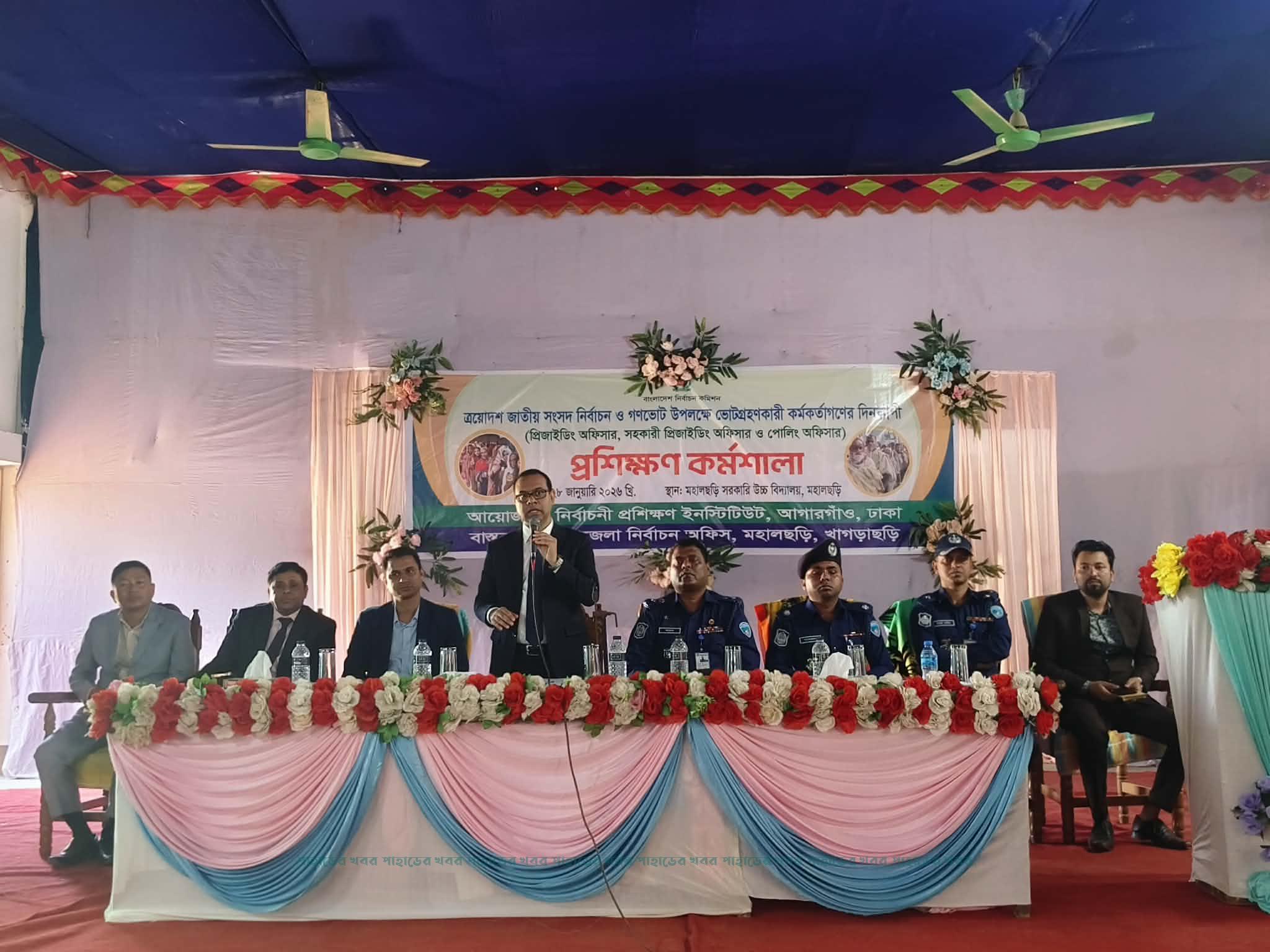 ত্রয়োদশ জাতীয় সংসদ নির্বাচনকে সামনে রেখে ভোটগ্রহণ কার্যক্রম সুষ্ঠু, শান্তিপূর্ণ ও গ্রহণযোগ্য করতে খাগড়াছড়ির মহালছড়িতে প্রশিক্ষণ কর্মশালা অনুষ্ঠিত হয়েছে। বুধবার (২৮ জানুয়ারি ২০২৬) মহালছড়ি সরকারি উচ্চ বিদ্যালয় অডিটোরিয়ামে এ প্রশিক্ষণ কর্মশালা অনুষ্ঠিত হয়।কর্মশালাটি নির্বাচন প্রশিক্ষণ ইনস্টিটিউটের আয়োজনে, এবং বাস্তবায়ন করে উপজেলা নির্বাচন অফিস মহালছড়ি।