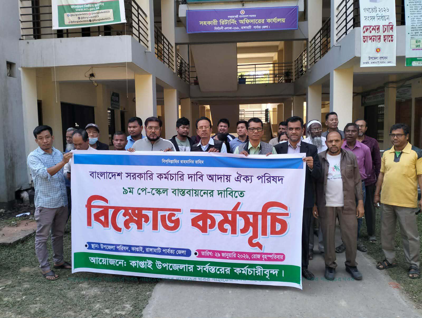 রাঙামাটির কাপ্তাইয়ে ৯ম পে স্কেলের দাবিতে উপজেলা সরকারি কর্মচারীদের বিক্ষোভ কর্মসূচি পালন করা হয়েছে।