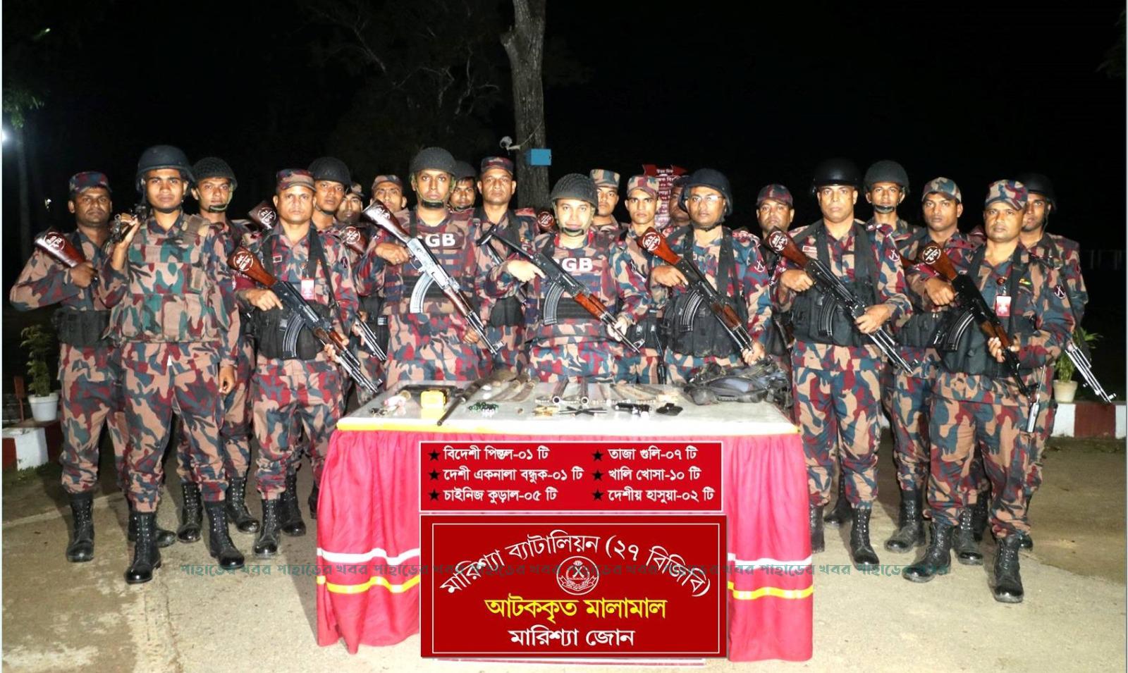 রাঙামাটির বাঘাইছড়ি উপজেলার মারিশ্যা জোন ২৭ বিজিবি’র অভিযানে অস্ত্র ও গোলাবারুদ উদ্ধার করা হয়েছে।। অভিযানে নেতৃত্ব দেন জোন কমান্ডার লেঃ কর্ণেল জাহিদুল ইসলাম জাহিদ। বিজিবি’র জোন কমান্ডার ও তার অধীনেস্থ সদস্যদের জীবনবাজি রেখে গহীন জংগলে এই সফল অভিযান পরিচালনা করেন।