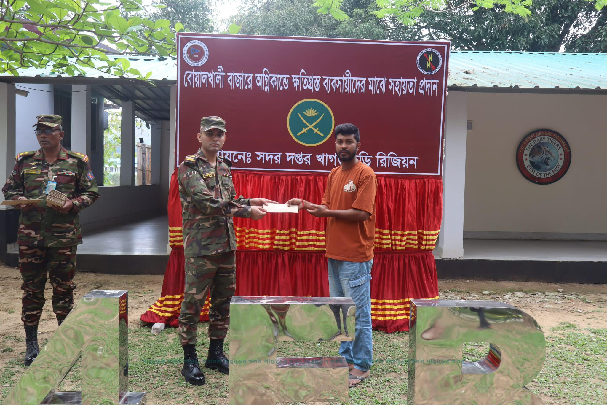 খাগড়াছড়িতে অগ্নিকাণ্ডের ক্ষতিগ্রস্ত ব্যবসায়ীদের পাশে দাড়িয়েছে বাংলাদেশ সেনাবাহিনীর খাগড়াছড়ি রিজিয়ন। আজ সোমবার (১৩ এপ্রিল) সকাল ১০টার দিকে দীঘিনালা জোনের আয়োজনে নতুন বোয়ালখালী বাজারে অগ্নিকান্ডে ক্ষতিগ্রস্ত ৪৮ জন ব্যাবসায়ীদের মধ্যে খাগড়াছড়ি রিজিয়নের পক্ষ হতে আর্থিক সহায়তা প্রদান করা হয়। এর মধ্যে ৩৪ জন ব্যাবসায়ীকে ১০ হাজার টাকা করে এবং ১৪ জন ক্ষুদ্র ব্যাবসায়ীদেরকে ৫ হাজার টাকা করে প্রদান করা হয়।