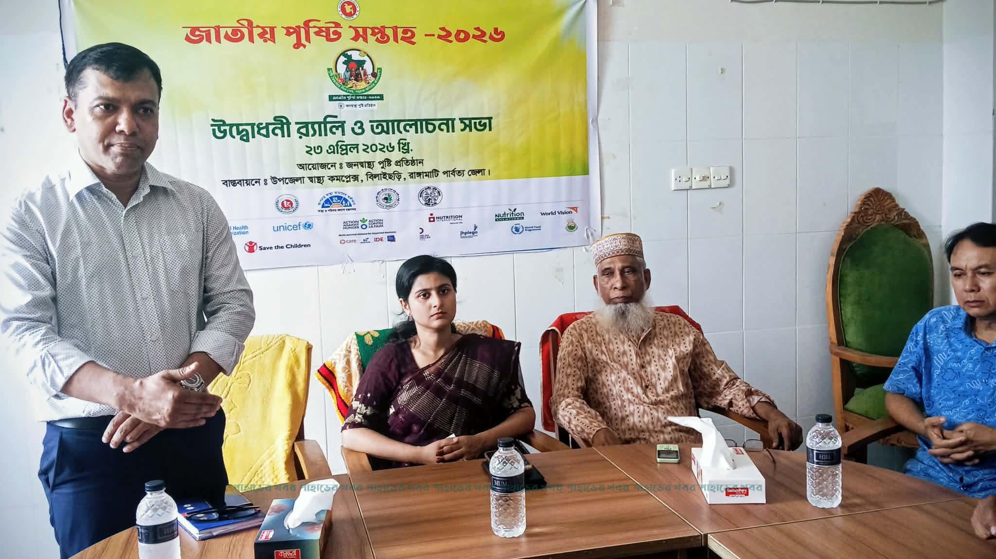 রাঙামাটির বিলাইছড়ি উপজেলা স্বাস্থ্য কমপ্লেক্সে কর্তৃক পুষ্টি সপ্তাহ পালন করা হয়েছে। বৃহস্পতিবার ( ২৩ এপ্রিল) জনস্বাস্থ্য পুষ্টি প্রতিষ্ঠানের আয়োজনে ‘জাতীয় পুষ্টি সপ্তাহ-২০২৬’ এর বর্ণাঢ্য উদ্বোধনী র্যালি ও আলোচনা সভা অনুষ্ঠিত হয়েছে। উপজেলা স্বাস্থ্য ও পরিবার পরিকল্পনা কর্মকর্তা ডাঃ সুরজিৎ দত্তের সভাপতিত্বে অনুষ্ঠানে প্রধান অতিথি হিসেবে উপস্থিত ছিলেন উপজেলা নির্বাহী কর্মকর্তা হাসনাত জাহান খান। বিশেষ অতিথি হিসেবে বক্তব্য রাখেন উপজেলা বিএনপি সভাপতি মোঃ আঃ সালাম ফকির, উপজেলা কৃষি সম্প্রসারণ কর্ম কর্তা মোঃ ওমর ফারুক।