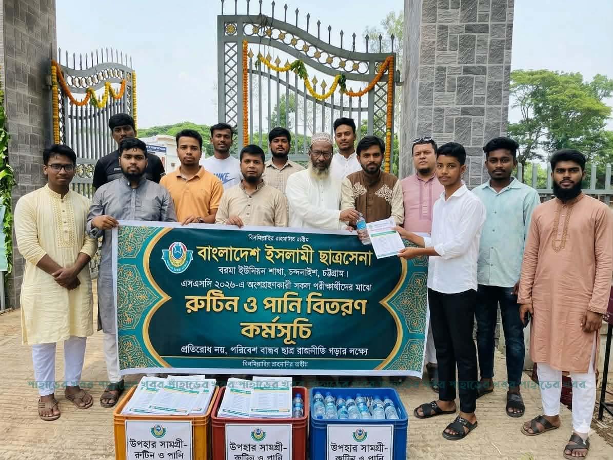 চন্দনাইশ বরমায় সুশৃঙ্খল সমাজ গঠনের অঙ্গীকার নিয়ে চট্টগ্রামের চন্দনাইশ উপজেলার বরমা ইউনিয়নে এসএসসি ২০২৬ পরীক্ষায় অংশগ্রহণকারী শিক্ষার্থীদের পাশে দাঁড়িয়েছে বাংলাদেশ ইসলামী ছাত্রসেনা। ২৬ শে এপ্রিল রবিবার বরমা ইউনিয়নের বরমা ত্রাহি মেনকা উচ্চ বিদ্যালয় পরীক্ষা কেন্দ্রে এসএসসি ২০২৬-এ অংশগ্রহণকারী সকল পরীক্ষার্থীদের মাঝে পরীক্ষার সময়সূচী (রুটিন) এবং বিশুদ্ধ খাবার পানি বিতরণ কর্মসূচি পালন করেছে বাংলাদেশ ইসলামী ছাত্রসেনা, বরমা ইউনিয়ন শাখা। তীব্র গরমে পরীক্ষার্থীদের স্বস্তি প্রদান এবং পরীক্ষার সময়সূচী নিয়ে সঠিক তথ্য পৌঁছে দেওয়ার লক্ষ্যেই এই সেবাধর্মী উদ্যোগ গ্রহণ করা হয়। কার্যক্রম চলাকালীন সংগঠনের নেতৃবৃন্দ পরীক্ষার্থীদের উজ্জ্বল ভবিষ্যৎ কামনা করেন এবং শান্ত পরিবেশে পরীক্ষা দেওয়ার আহ্বান জানান।