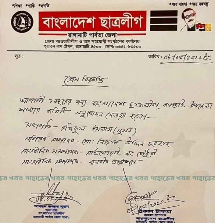 এই বিষয়ে প্রকাশ চাকমা জানান, কাপ্তাই উপজেলা আওয়ামী লীগের সভাপতি ও সম্পাদকের সুপারিশে আমরা রফিকুল ইসলাম সুমন কে সভাপতি, মোঃ নিজাম উদ্দিন ফরহাদকে সাধারণ সম্পাদক এবং সাইথোয়াই অং চৌধুরী ও মনবীর তঞ্চঙ্গ্যাকে সাংগঠনিক সম্পাদক করে আগামী ১ বছরের জন্য কাপ্তাই উপজেলা ছাত্রলীগের আংশিক কমিটি ঘোষণা করি। কিন্তু কমিটি ঘোষণার পরক্ষণে আমরা জানতে পারি যে, নতুন কমিটির সভাপতি ও সম্পাদক নিয়মিত ছাত্র না।